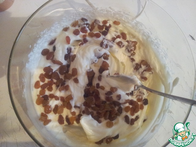 • Сметану взбить с сахарной пудрой до устойчивых пиков. Если вы не уверены, что сметана взобьется, тогда рекомендую вам добавить закрепитель. А вообще, если есть время, то для того что бы взбилась сметана, ее необходимо откинуть на сложенную в 4 раза марлю на 2-3 часа, что бы стекла лишняя жидкость. Прямо в крем добавить сухофрукты (у меня просто изюм) и подсушенные в духовке орехи (я не добавляла), оставив немного орехов для обсыпки.