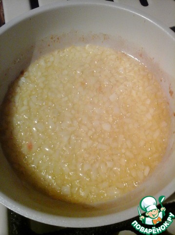 На сковороду влить 2 столовые ложки оливкового масла, добавить 30 граммов сливочного масла. Слегка спассеровать мелко нарезанный лук.