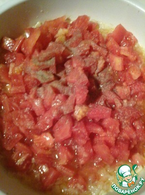 Добавить помидоры к луку, посолить, поперчить и тушить на сильном огне 5 минут.