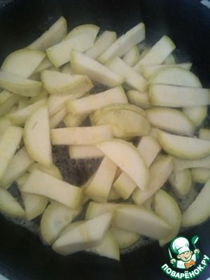 Режим кабачки не сильно мелко, и обжариваем на сливочном масле, но не все, а только все по чуть, чтоб был всего один слой на сковороде. И так все овощи. С начало я обжарила один кабачок потом другой.