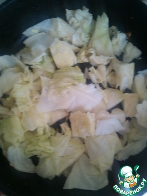 Потом режим капусту не мелко, квадратиками и обжариваем, обжаривала капусту в две порции.