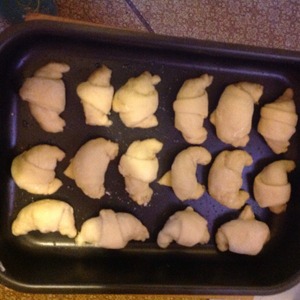 Разогреваем духовку до 200 градусов. Тесто не крутое, поэтому у меня на присыпку теста ушло еще 4-5 ст. л. муки. Раскатываем в пласт 5-7мм, режем на треугольники. Каждый треугольник смазываем растопленным или размягченным сл. маслом. На основание треугольника кладем чайную ложку начинки и скручиваем в роглики.