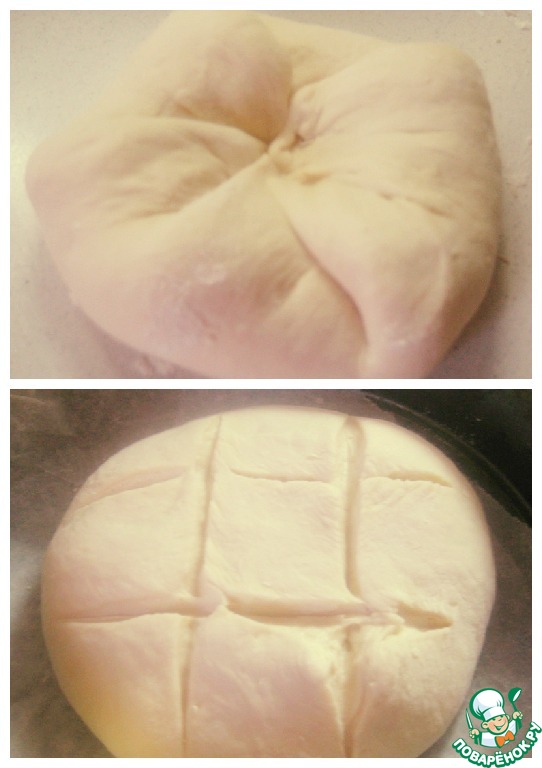 Формируем хлебушек. Растягиваем тесто в пласт, затем заворачиваем края к середине «конвертом», формируя округлый хлебушек.