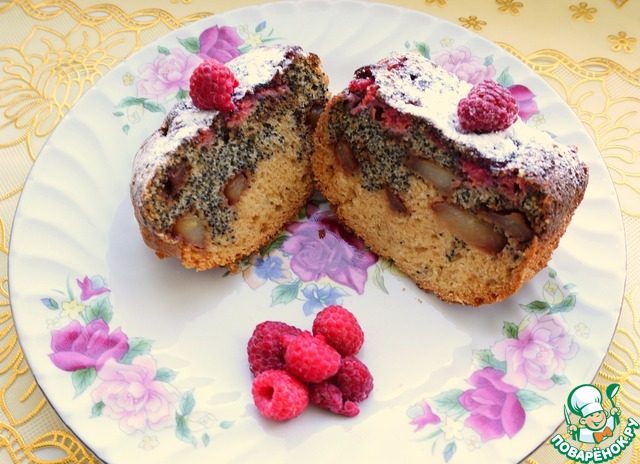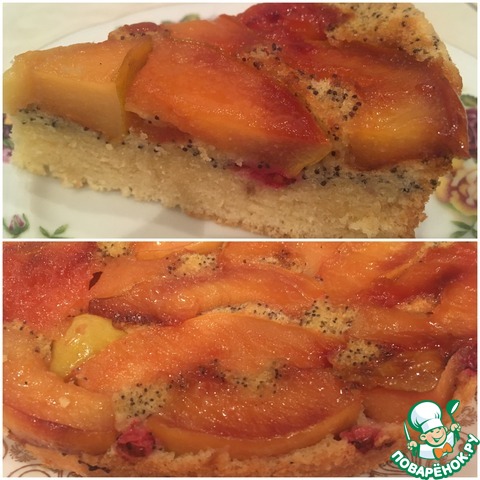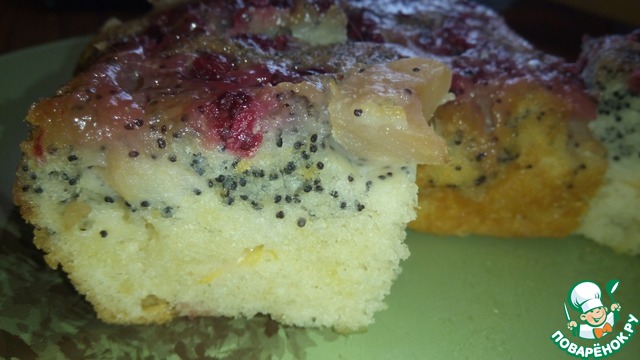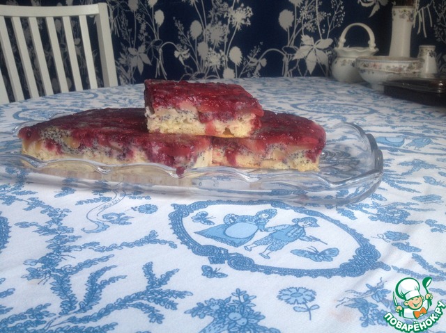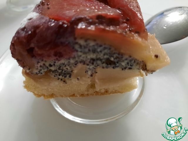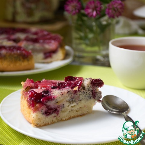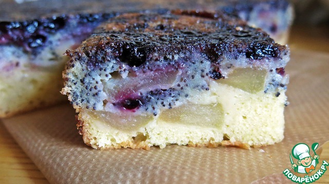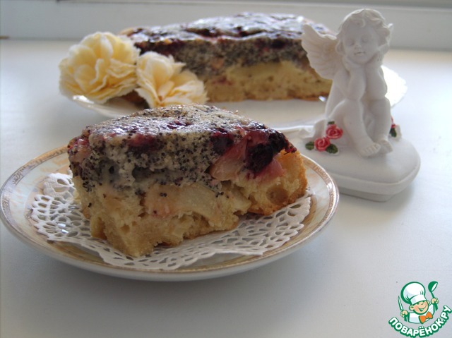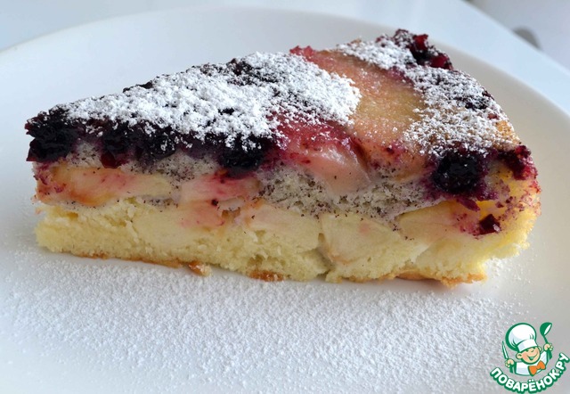 Потом с помощью разделочной доски перевернуть пирог, снять форму и удалить бумагу. Когда пирог полностью остынет, можно его посыпать сахарной пудрой. Этот пирог можно печь с одними яблоками, поверхность его будет очень интересная - яблочные дольки, а между ними маковое тесто. Выглядит очень импозантно. А с ягодами вот так.