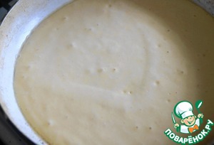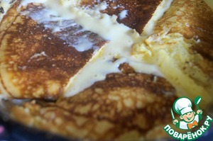 Сковороду разогреваем, смазываем сливочным маслом и выливаем 1/2 получившейся яичной массы. Готовим до образования красивой корочки, режем ножом на 4 части. -