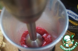 Для малинового кули малину пробиваем блендером, протираем через сито, добавляем сахар и взбиваем. Выливаем в соусник.