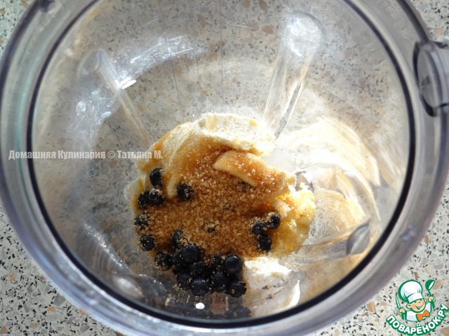 В блендер погрузить масло (комнатной температуры), творог, сметану, сахар, 1 ст. л. черники и миндаль;