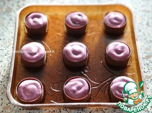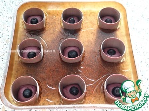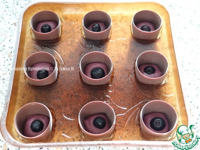 Наполнить стаканчики на половину массой, в середину положить по черничке;