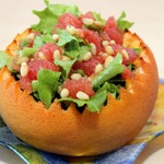 Из второй половины грейпфрута выжать сок, добавить в него оливковое масло, соль, перец, приправу к салатам.