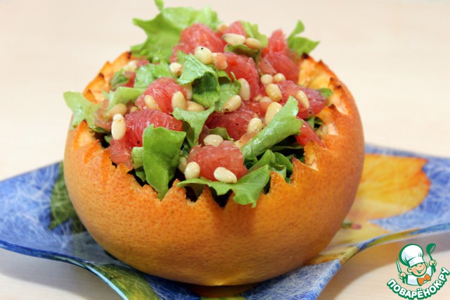 Очистить грейпфрут, половину мякоти разделить на небольшие кусочки, сняв с них пленку. Перемешать все имеющиеся у вас листья салата, добавить кусочки грейпфрута.