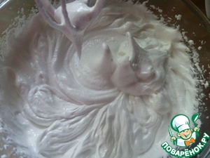 Охлажденные белки взбить в крепкую пену, затем понемногу добавить сахар и ванильный сахар, каждый раз взбивая до крепкого безе. -