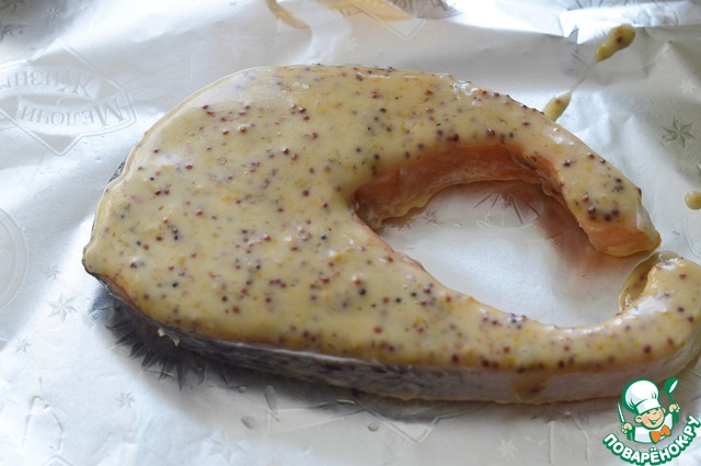 2. Духовку разогреть до 180С. Рыбу выложить на фольгу, сверху выложить половину соуса. Поставить рыбу в духовку на 10 минут. Время готовки зависит от величины куска рыбы.