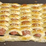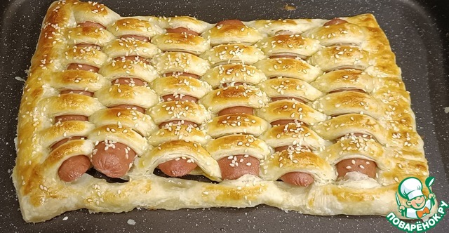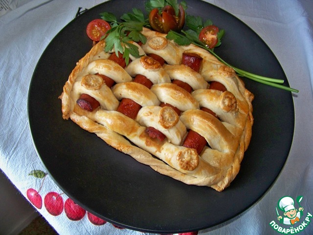 Слоеное тесто - это палочка-выручалочка, готовое тесто, с которым можно быстро приготовить вкусное блюдо. Предлагаю рецепт экспресс-блюда из доступных продуктов: слоеного теста и сосисок. Сосиски надо брать длинные, тогда и плетёнка получится большая. Вот тут я промахнулась, взяла сосиски, которые любит дочки, а они длиной не отличаются, так что пирог получился не такой большой.