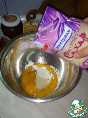 Желтки отделить от белков и вылить в металлическую посуду. Добавить сахар, ванильный сахар и апельсиновый сок. Взбить на горячей водяной бане (взбивать около 5 мин).