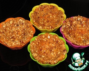 Даем хлопьям остыть, затем смешиваем их с сухофруктами. Смесь получится похожей на пластилин, немного будет липнуть к рукам, но в целом станет очень податливой. Выкладываем смесь в формы, равномерно распределив ее по дну и стенкам, чтобы смесь образовала форму корзинок. Убираем формочки в морозильную камеру на 5-10 минут, до полного охлаждения и застывания.