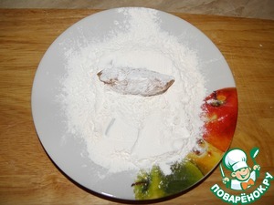 В тарелку насыпать крахмал, и хорошо обвалять в нем каждый кусочек. ( специи проверяем, можно чуть соли и перца)