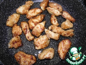 В сковородку налить достаточное количество растительного масла, и обжарить курочку до корочки ( жарить не долго, не пересушить!)