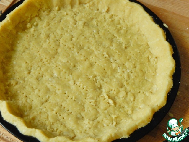 Разогреваем духовку до 180 градусов. Форму для выпечки, у меня 26 см, маслом затем присыпаем панировочными сухарями. Распределяем тесто по форме обязательно с бортиками. дно накалываем вилкой. Ставим выпекаться на 30 минут.