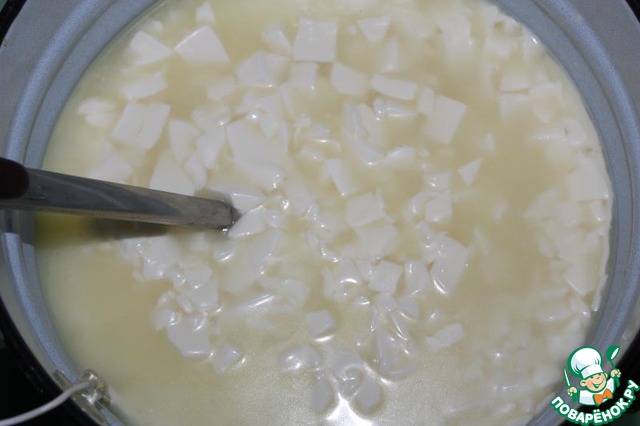 Молоко нагреть до температуры 32 градуса. Добавить мезофильную закваску. Если у Вас нет специальной сырной закваски, используйте сметану, сыворотку или пахту. Количество закваски по инструкции, если заменяете сметаной и т. п., то 5 ст. л. Если используете пастеризованное молоко, то внесите хлористый кальций, растворенный в воде. Через полчаса внесите сычужный фермент. Оставьте молоко на 30-60 минут до достижения чистого излома. Нарежьте сгусток на кубики со стороной 10 мм. Оставьте на 10 минут.