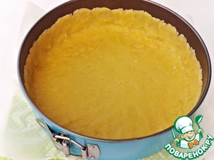 Разъемную форму (d=24 см) застелить пекарской бумагой. Тесто раскатать и при помощи скалки перенести в форму, если разорвется - слепить пальцами. Сформировать бортики. Форму с тестом поставить в холодильник на 20 минут.