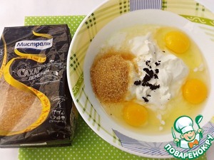 Готовим заливку. Сметану, сахар, яйца и семена ванили (ванильный стручок острым ножом разрезать пополам и соскоблить семена) перемешать венчиком.