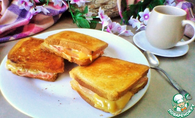Теперь наши сэндвичи с обеих сторон обжариваем на сковороде на маленьком огне до золотистого цвета хлеба (если у Вас есть бутербродница, то лучше воспользоваться ею, но и на сковороде будет тоже хорошо). При этом лопаткой легонько прижимаем верхний ломтик хлеба.