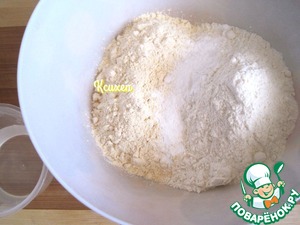 Для теста смешиваем два вида муки с разрыхлителем. Отдельно в чуть тёплой воде растворяем соль и сахар.