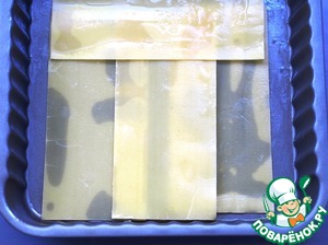 Включить на 190 градусов духовку. Взять прямоугольную или квадратную форму (у меня квадратная 22х22х8см, с антипригарным покрытием), немного смазать сливочным маслом и начать сборку нашей лазаньи. На один слой я брала 4 листа.