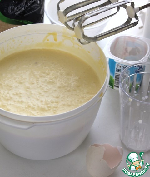Яйца взбить миксером с коричневым сахаром ТМ Мистраль до пышной пены, постепенно добавить молоко, йогурт, сливочный сыр, постоянно взбивая.