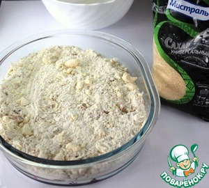 Холодное сливочное масло нарезать мелкими кубиками и смешать с мукой в мелкую крошку.