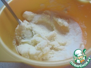 Сахар, ванильный сахар и масло (маргарин) размягченный растереть.