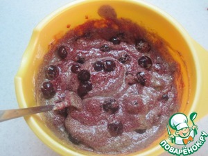Теперь добавить вишню (без сока желательно) и все аккуратно перемешать. Выложить в форму и выпекать при температуре 160-180 гр. 45-60 мин (все зависит от вашей духовки)