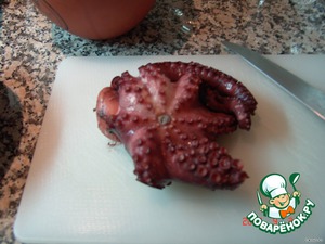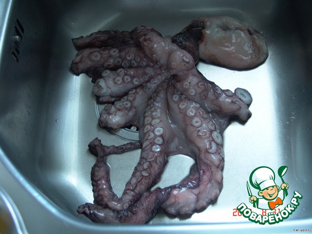 Осьминога хорошо промыть холодной водой, удалить хитиновый "клюв" между присосками (если его не удалили при покупке). Eсли покупаете осминога мороженого, то они уже обработанные, готовые к варке. Eсли свежий или даже живой, то попросите продавца его подготовить.