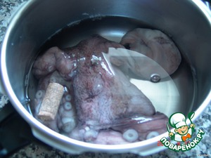 Положить в кастрюлю, залить водой (не солить). Для того, чтобы осьминог при варке не превратился в резину, а наоборот, стал мягким, существует особый секрет. Положить в воду перед варкой пробку (из натуральной пробки) от закупорки вина или луковицу, которую в конце варки выбрасывают. Я обычно пользуюсь скороваркой. Ставлю на мах. давление один раз. Обычно это занимает не более 30 мин. После варки мясо осьминога должно стать мягким.