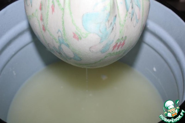 Ткань подвесьте для того, чтобы стекла сыворотка. Периодически перемешивайте сырную массу, чтобы сыворотка лучше отделялась. Стекает сыворотка несколько часов до тех пор, пока не начнут лепиться шарики. Если сыворотки в сырной массе останется много, то шарики будут расплываться и не будут держать фориу, если сырную массу пересушить, то она не будет слипаться.
