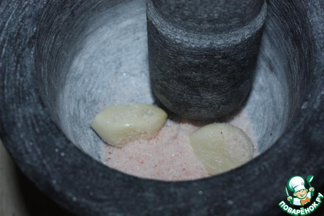 В ступке растолочь чеснок с солью. В рецепте используется розовая гималайская соль, но, если у Вас ее нет, можно использовать обычную.