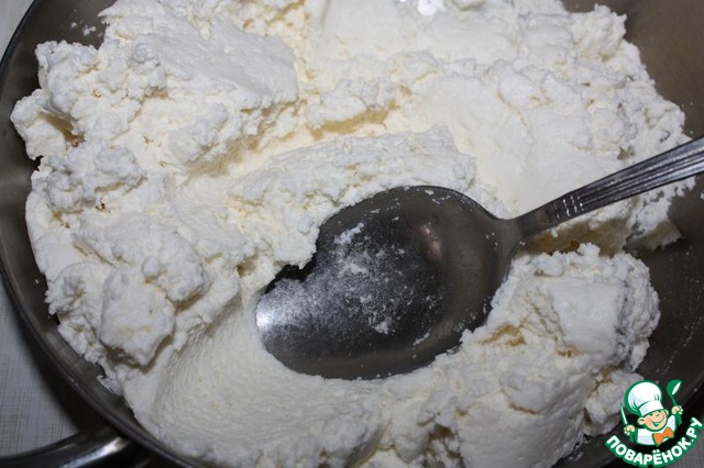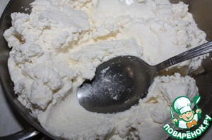 Оставить при комнатной температуре на 12-14 часов. Выстелите дуршлаг тканью и выложите образовавшийся сгусток шумовкой в ткань.