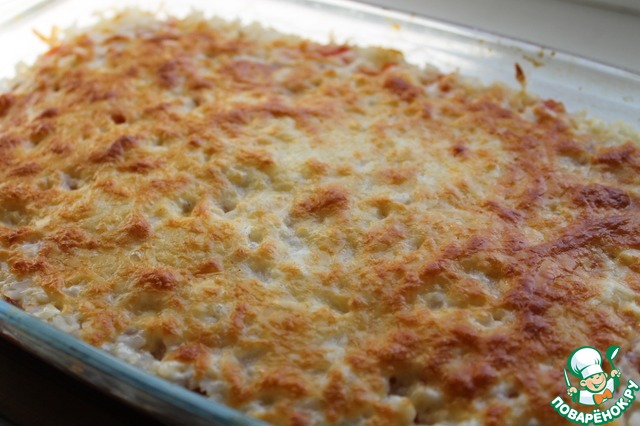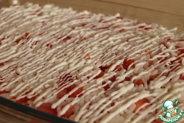 Сеточка из майонеза. Запеканку полить бульоном из кубиков (это в оригинале. Я же просто немного перчу и солю каждый слой)