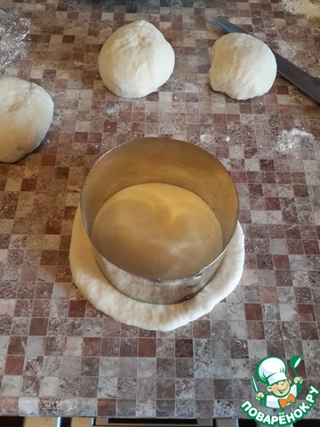 Тесто разделить на равные кусочки, скатать из них шарики. Каждый шарик раскатать в лепешечку. Выемкой или стаканом вырезать кружочек