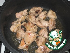 Рубим нашего куренка на небольшие кусочки. Я пробовала делать из филе, но все-таки, когда мясо на кости, блюдо получается ароматнее.