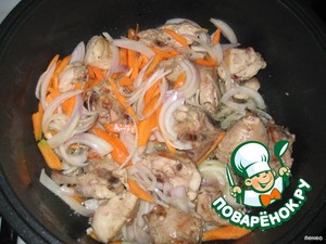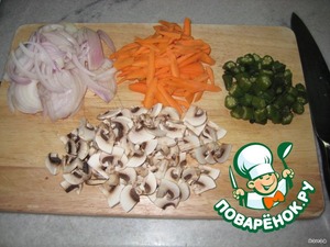 Лук режем полукольцами, морковку на дольки, кура вдоль, грибы произвольно.