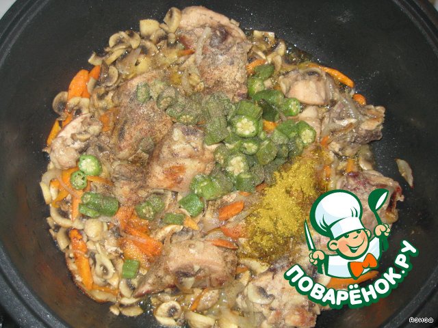 Следущая по программе кура, соль, перец, порошок карри (по вкусу). Перемешали, закрыли крышкой. Тушим 10 мин.