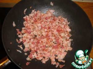 Бекон порезать тонкими полосками вдоль, обжарить несколько минут (не пересушить). Переложить в тарелку