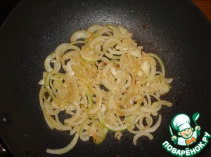 Лук режим полукольцами, обжариваем в той же сковородке (на жирке от бекона). только не сильно зажаривайте. кто делает с чесноком, то обжарить жеснок вместе с луком. перекладываем в тарелку к бекону