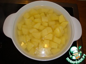 Картошку порезать кубиками, посолить, отварить до полной готовности (но не переварить), воду хорошо сцедить
