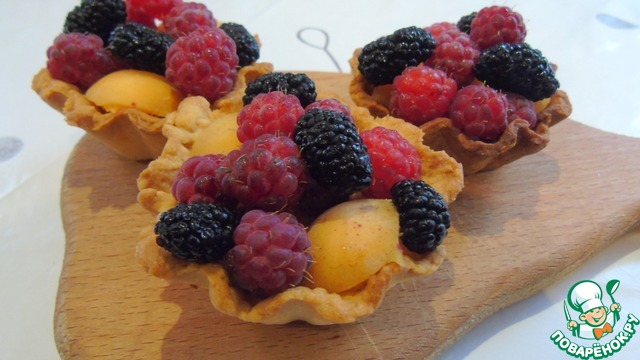 Выпекать в разогретой до 180С духовке 15 минут, до золотистого цвета. Полностью остужаем и наполняем ягодами по вкусу, у меня малина, шелковица и абрикосы.