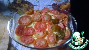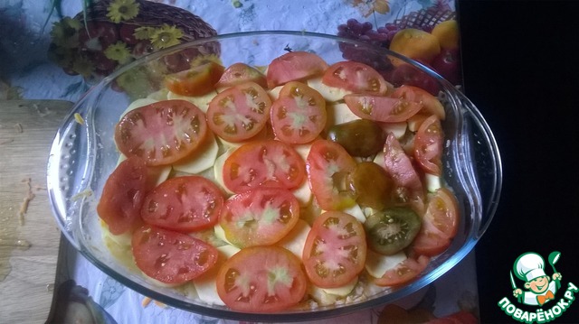 Нарезаем тоненькими кружочками кабачок и кладем следующим слоем. Поверх кабачков нарезанный помидор.