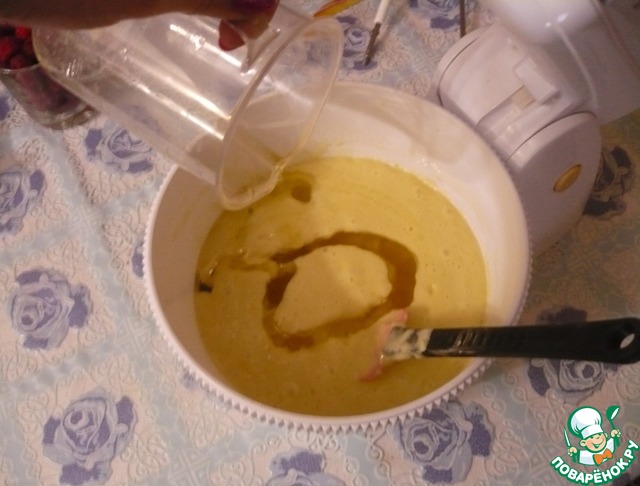 • Выложите половину теста в форму для кекса, смазанную сливочным маслом и чуть присыпанную мукой. Распределите по центру малину, она не должна касаться краев. Затем накройте малину оставшейся массой.