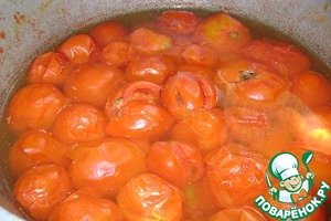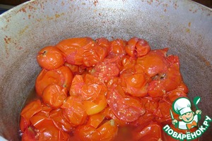 Заливаем стаканом воды и доводим до кипения, изредка перемешивая, чтобы нижние помидоры не пригорали.