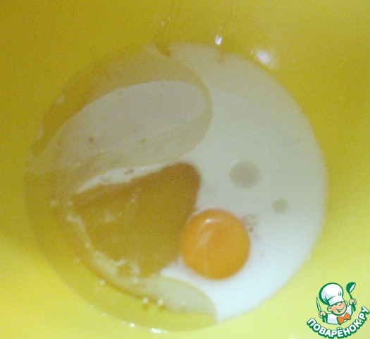 В отдельной миске смешиваем яйцо, жидкий мед, растительное масло, молоко.
